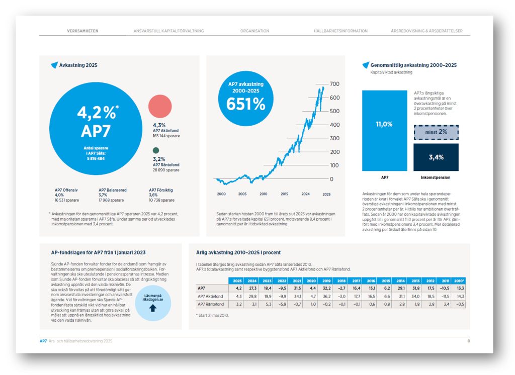 AP7 publicerar års- och hållbarhetsredovisning för 2025. AP7 avkastade 4,2 procent varav AP7 Aktiefond 4,3 procent och AP7 Räntefond 3,2 procent. Året präglades av turbulenta finansiella marknader, stärkt organisation, fortsatt utvecklat hållbarhetsarbete och fördjupad förståelse för Såfa-spararna.