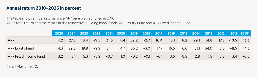 Since inception, AP7 Såfa has provided the Swedish pension savers higher average returns than the return goal and has kept low management fees in the premium pension system.